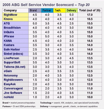 著名企業(yè)咨詢公司ABG(Allen Bonde Group )近日對著名自助服務(wù)軟件制造商進(jìn)行了綜合評估。此次評估綜合考慮廠商在四個(gè)類別中的表現(xiàn):品牌、合作伙伴、技術(shù)水平、實(shí)施。綜合評估滿分為20分。