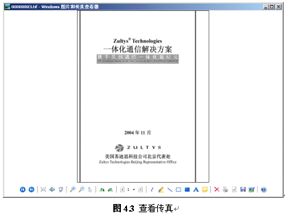 用戶可以顯示、保存、移動、刪除、復(fù)制傳真,也可以回撥傳真來電號碼。選擇顯示傳真時,系統(tǒng)自動調(diào)用圖片處理軟件打開傳真(不同的操作系統(tǒng)軟件或版本所帶軟件不同,下圖僅供參考)。