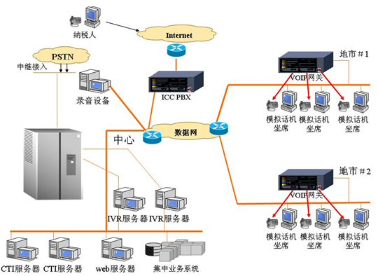 在河北地稅12366原有設備的基礎上,增加了一臺ICC PBX,開放了若干端口,并在坐席計算機上部署了ICC終端軟件,將12366傳統(tǒng)的第四代呼叫中心,升級為第五代呼叫中心。