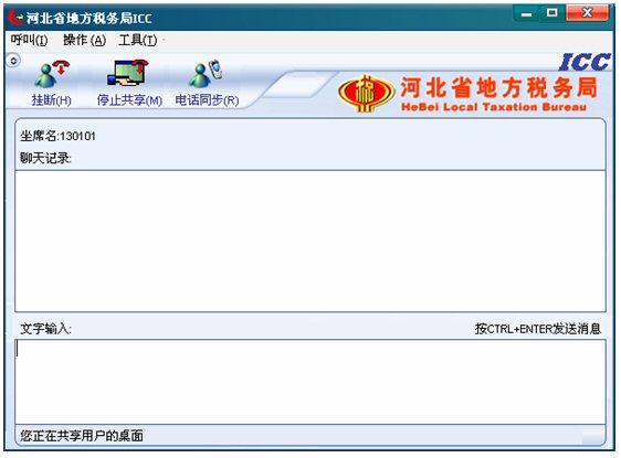 收到納稅人共享請求提示,如果坐席現(xiàn)在為全屏,收到納稅人共享請求,ICC界面將會自動跳到全屏的前端,彈出共享框。如果坐席現(xiàn)在不是全屏,收到納稅人共享請求,任務欄里ICC對話框將自動閃爍,彈出共享框。