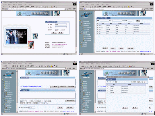 企業(yè)里的每個用戶要實現(xiàn)短信發(fā)送,僅需一臺電腦,然后利用瀏覽器就可以實現(xiàn)分組發(fā)送(如:會議通知、緊急通知)、定時群發(fā)(如:提醒短信、恭賀短信、祝福短信)、以及接收工作情況匯報短信等,系統(tǒng)提供通訊薄管理,可編輯常用短語。服務器端支持多個GSM設備群發(fā),滿足不同發(fā)送短信量的需要?煨┫螺d系統(tǒng)的動畫演示,新增功能多多。。
