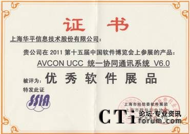 CTI論壇(ctiforum)6月1日消息(記者 潘婷婷): 近日,由工業(yè)和信息化部、國家發(fā)展和改革委員會(huì)、科學(xué)技術(shù)部、國家外國專家局和北京市人民政府共同主辦,中國軟件行業(yè)協(xié)會(huì)、中國電子信息產(chǎn)業(yè)發(fā)展研究院等單位承辦的第十五屆中國國際軟件博覽會(huì)參評軟件產(chǎn)品評獎(jiǎng)揭曉,經(jīng)過專家組的嚴(yán)格評審及在技術(shù)領(lǐng)先性、應(yīng)用價(jià)值等評審指標(biāo)下,由上海市經(jīng)信委軟件展團(tuán)及上海市軟件行業(yè)協(xié)會(huì)共同頒發(fā)華平股份優(yōu)秀組織獎(jiǎng),所參展的 “AVCON UCC統(tǒng)一協(xié)同通訊系統(tǒng)V6.0”、“AVCON視頻會(huì)議系統(tǒng)V6.0”兩款產(chǎn)品被評為優(yōu)秀軟件展品。