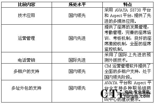 綜合比較,深圳電信商業(yè)呼叫中心的建設(shè)處于國內(nèi)領(lǐng)先階段,有些技術(shù)甚至處于國際先進的水平。比較如下:
