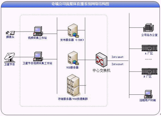 要在企業(yè)內網(wǎng)與廣域網(wǎng)上對有線電視、衛(wèi)星電視及現(xiàn)場視頻進行實時直播,這需要系統(tǒng)具備高兩種傳輸方式,內網(wǎng)實現(xiàn)組播協(xié)議,互聯(lián)網(wǎng)實現(xiàn)單播協(xié)議。同時要求系統(tǒng)傳輸速率、數(shù)據(jù)同步、數(shù)據(jù)流的分流、高穩(wěn)定性等特性。而實現(xiàn)網(wǎng)絡的視、音頻傳輸最好的解決方案就是流式媒體的傳輸方式。