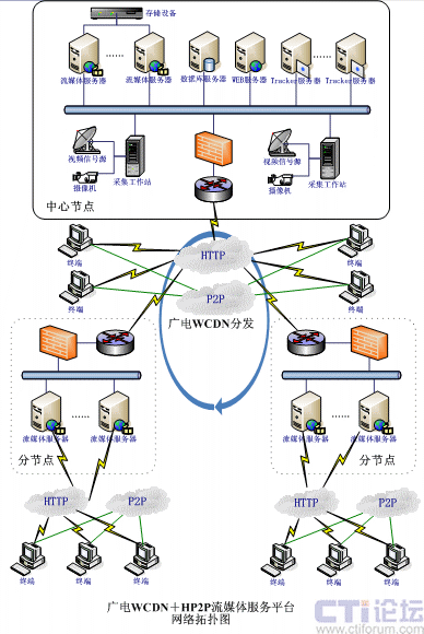 根據(jù)以上情況,廣電系統(tǒng)的流媒體服務平臺采用VIEWGOOD流媒體服務平臺,利用HP2P、WCDN技術(shù)進行分級部署;以下給出網(wǎng)絡拓撲圖:
