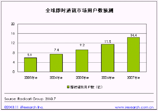年即時通訊將成為互聯(lián)網(wǎng)上最普及的交流方式。隨著即時通訊的普及,全球即時通訊用戶規(guī)模也在不斷擴大。即時通訊市場龐大的用戶規(guī)模和增長潛力早已引起了業(yè)內巨頭的激烈競爭。以美國為例,目前,AOL、MSN