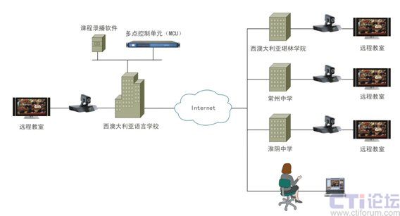 中澳遠程教育系統(tǒng)采用科達KDV8000C多點控制單元(MCU)1臺和課程錄播軟件1套安裝在西澳大利亞語言學院,4臺TS6610視頻會議終端,分別安裝在西澳語言學院、堪林學院、常州中學和淮陰中學的遠程教室。此外,考慮到遠程授課的實際應(yīng)用需求,系統(tǒng)還提供了無線麥克接入方案。系統(tǒng)部署拓撲圖見下圖。