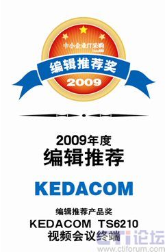 CTI論壇(ctiforum)05月20日消息: 近日,由《中小企業(yè)IT采購(gòu)》舉辦的2009年度編輯推薦獎(jiǎng)評(píng)測(cè)活動(dòng)落下帷幕,科達(dá)TS6210視頻會(huì)議終端以其卓越的視音頻質(zhì)量、優(yōu)異的網(wǎng)絡(luò)適應(yīng)性、極高的性價(jià)比在本次評(píng)選活動(dòng)中脫穎而出,獲此殊榮。