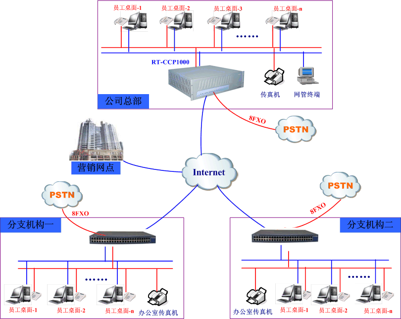 項(xiàng)目建設(shè)中,既要充分考慮到后續(xù)隨時(shí)隨地分支機(jī)構(gòu)的加入,又要考慮中繼線路的擴(kuò)容等因素。融天科技RT-CCP1000融和通信一體化平臺,既能靈活的實(shí)現(xiàn)企業(yè)異地組網(wǎng)方式,又能方便的位企業(yè)定制各種個(gè)性化的增值業(yè)務(wù),如自動值機(jī)、語音郵箱、電話會議、個(gè)人傳真等個(gè)性化業(yè)務(wù),不用增加任何硬件設(shè)備的情況下還能輕松的實(shí)現(xiàn)呼叫中心功能、與用戶方已有的ERP、CRM系統(tǒng)對接功能等,方案組網(wǎng)如下: