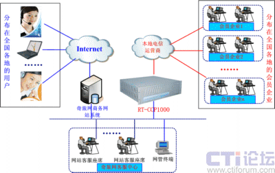 融天科技采用自主研發(fā)的融合通信平臺RT-CCP1000設(shè)備一套為奇旅網(wǎng)部署了一套Web-call聯(lián)絡(luò)中心。RT-CCP1000集傳統(tǒng)PBX、IP-PBX、CTI、IVR、DB、VOIP、錄音、傳真等服務(wù)于一體,以模塊化的形式提供用戶所需的各種功能,是一套功能強大的一體化融合通信平臺,安裝部署非常方便,維護管理非常簡單。該方案中,與本地電信運營商采用數(shù)字中繼E1接口和模擬中繼FXO接口方式連接,軟電話以控件方式嵌入到奇旅網(wǎng)公司的商務(wù)網(wǎng)站上, RT-CCP1000將接收所有以該控件方式來至Internet來的呼叫,并通過與電信運營商接口呼叫相關(guān)會員企業(yè)綁定的聯(lián)絡(luò)電話,這樣就實現(xiàn)了上網(wǎng)用戶通過電腦與會員企業(yè)免費進行直接聯(lián)絡(luò)。網(wǎng)絡(luò)拓撲圖如下: