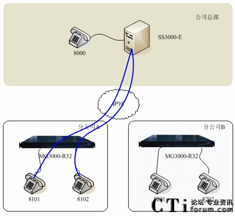 圖一:方案1:SS3000-E與IPPBX MG3000-R32聯(lián)合組網示意圖