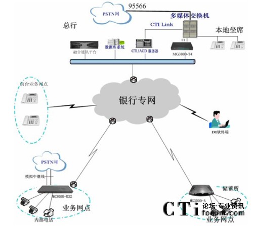 本設(shè)計(jì)方案在內(nèi)蒙中行總部的專(zhuān)網(wǎng)配置統(tǒng)一的控制管理平臺(tái)用于對(duì)下面各網(wǎng)點(diǎn)終端的統(tǒng)一控制管理,另外配置多E1 IP數(shù)字中繼網(wǎng)關(guān)和中行內(nèi)部的電話(huà)銀行交換機(jī)對(duì)接,實(shí)現(xiàn)IP話(huà)路和中行的電話(huà)銀行系統(tǒng)的互聯(lián)。下面各網(wǎng)點(diǎn)、理財(cái)中心部署IP專(zhuān)線(xiàn)電話(huà)終端,用于銀行客戶(hù)在各營(yíng)業(yè)網(wǎng)點(diǎn)拿起話(huà)筒就自動(dòng)自動(dòng)撥號(hào),通過(guò)銀行專(zhuān)網(wǎng)進(jìn)入電話(huà)銀行系統(tǒng)進(jìn)行語(yǔ)音互動(dòng)。