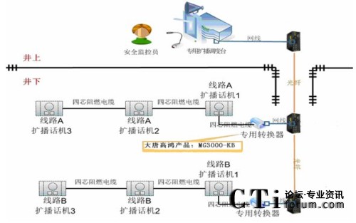系統(tǒng)采用全分布式控制結構。主要由專用防爆轉換器(MG3000-KB)、防爆擴播電話機、隔爆兼本安型電源和專用擴播調度臺構成。專用擴播調度臺位于地面中央控制室,專用擴播調度臺與專用轉換器之間采用工業(yè)以太網(wǎng)絡連接,專用防爆轉換器與防爆擴播電話機之間采用總線結構聯(lián)接。