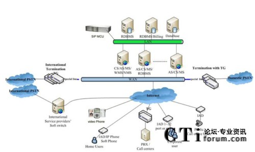 計費(fèi)系統(tǒng)將把視頻通話和普通的語音通話分開來計費(fèi),視頻會議業(yè)務(wù)也可以作為一項特殊業(yè)務(wù)單獨(dú)計費(fèi)。所有這些業(yè)務(wù)都使用相同的計費(fèi)和OAM系統(tǒng)。在這個運(yùn)營商級軟交換系統(tǒng)中,已經(jīng)把視頻業(yè)務(wù)完全集成進(jìn)了系統(tǒng)。下面是網(wǎng)絡(luò)示意圖: