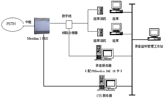 使用Music Telecom PBXmedia DAC 16線數(shù)字PBX錄音監(jiān)聽接口卡,直接與北電Meridian 1交換機(jī)的數(shù)字用戶線的分接線連接,實現(xiàn)并線錄音。其物理結(jié)構(gòu)如下所示: