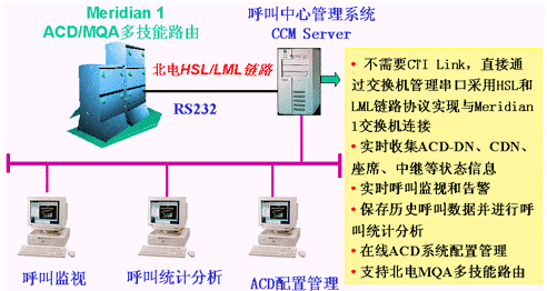 華呼CCM系統(tǒng)不需要Meridian Link,直接通過交換機管理串口采用HSL(High-Speed Link)和LML(Load Management Link)鏈路協(xié)議實現(xiàn)與Meridian 1交換機連接;實時收集ACD座席、隊列、中繼等狀態(tài)信息,提供實時監(jiān)控和告警;保存各類歷史呼叫數(shù)據(jù),提供多種統(tǒng)計分析手段;提供ACD有關(guān)參數(shù)的實時和預(yù)定配置管理功能;支持北電MQA(Multiple Queue Assignment)技能路由功能,使座席可同時登錄到5個ACD隊列,在交換機內(nèi)部實現(xiàn)技能路由;對各類數(shù)據(jù)分析以表格、直方圖、餅圖等方式進(jìn)行直觀顯示并可進(jìn)行打印,以及提供多樣的告警提示。