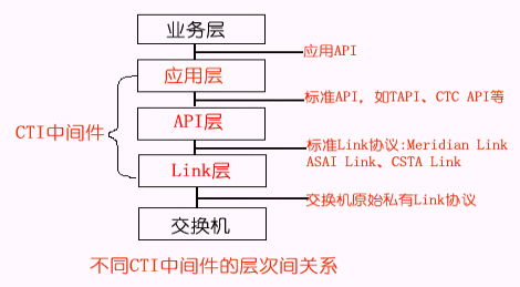 根據(jù)CTI的功能定位,我們可以把CTI產(chǎn)品劃分為不同的層次,一般地可分為三種類型:Link層產(chǎn)品、API層產(chǎn)品、應(yīng)用層產(chǎn)品,其分層結(jié)構(gòu)示意圖如下所示: