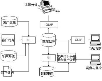 數(shù)據(jù)主要有四個方面的來源:客戶信息、客戶行為、生產(chǎn)系統(tǒng)和其它相關數(shù)據(jù)。這些數(shù)據(jù)通過抽取、轉換和裝載過程,形成數(shù)據(jù)倉庫,并通過OLAP和報表,將客戶的整體行為分析和企業(yè)運營分析等傳遞給數(shù)據(jù)倉庫用戶。