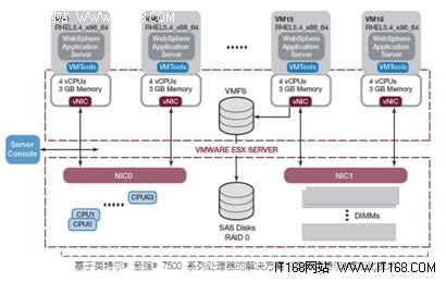另外,由于電信行業(yè)的特殊性,許多舊的應(yīng)用無(wú)法快速有效的部署在新平臺(tái)下,造成服務(wù)器利用低,服務(wù)器的數(shù)量越來(lái)越多的問(wèn)題,為此,英特爾與東軟也從幾年前開(kāi)始進(jìn)行密切合作,在早期的英特爾至強(qiáng)7300、至強(qiáng)7400、至強(qiáng)7500等一系列四路高端服務(wù)器平臺(tái)上搭建了虛擬化解決方案,使過(guò)去電信舊的應(yīng)用能夠很快在新平臺(tái)上進(jìn)行部署。下圖顯示的是東軟以?xún)膳_(tái)基于英特爾至強(qiáng) 7500 系列處理器的四路服務(wù)器為基礎(chǔ),構(gòu)建了整個(gè) BSS 架構(gòu):
