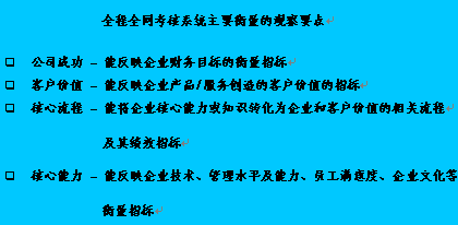 根據(jù)公司制定的策略目標(biāo),將平衡記分卡體系引入客戶服務(wù)的全程全網(wǎng)考核系統(tǒng)當(dāng)中,這一體系能比較全面和客觀地反映客戶關(guān)系中心的運(yùn)營績效。完成整個(gè)全程全網(wǎng)考核系統(tǒng)設(shè)計(jì)的關(guān)鍵的成功因素為: