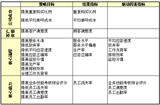 1)公司成功;2)客戶價(jià)值;3)核心流程;4)核心能力;成為呼叫中心全程全網(wǎng)考核衡量的四大維度,實(shí)際反映了呼叫中心運(yùn)營管理中成本、客戶、內(nèi)部流程及呼叫中心的學(xué)習(xí)與成長的四個(gè)至關(guān)重要的領(lǐng)域,是實(shí)現(xiàn)公司遠(yuǎn)景規(guī)劃與使命的營運(yùn)管理核心。
