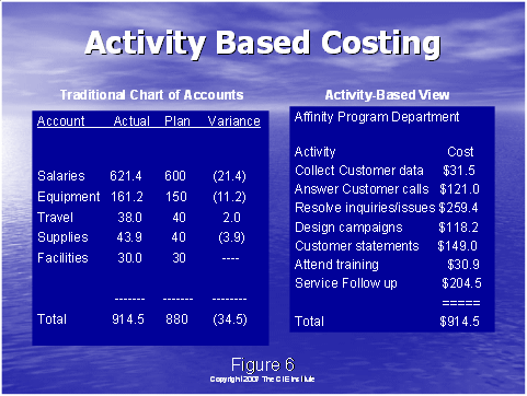 呼叫中心的成本被傳統(tǒng)地細(xì)分在圖6的左手邊,并根據(jù)行動細(xì)分在右手邊。拿第2項舉例:回答客戶的電話用來決定每個呼入服務(wù)電話的成本是5美元。總額121,000美元除以呼入服務(wù)電話的數(shù)量,有24,200個電話達(dá)到了5美元。