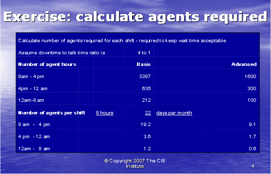 在我們計(jì)算出所需的座席數(shù)之前,我們必須了解一個(gè)座席的付薪工作時(shí)間和他的通話時(shí)長的區(qū)別,通話時(shí)長是座席真正花在電話上面對(duì)客戶的時(shí)間。一個(gè)座席不會(huì)一直處理電話,其它的時(shí)間用于培訓(xùn),休息,與主管獨(dú)處,部門會(huì)議,公司內(nèi)部為給客戶提供準(zhǔn)確的回答而進(jìn)行研究,對(duì)內(nèi)對(duì)外寫郵件,準(zhǔn)備下一個(gè)客戶的電話。在每個(gè)呼叫中心中,通話時(shí)長和停工時(shí)長的比率是不同的。對(duì)于復(fù)雜易變的產(chǎn)品,花在培訓(xùn)上的時(shí)間會(huì)更多。在新產(chǎn)品被頻繁介紹的呼叫中心,就需要更多的時(shí)間去研究關(guān)于新產(chǎn)品的回答。為了更精確,一個(gè)座席一周的工作時(shí)長應(yīng)該與其通話時(shí)長相比較,以便真正確定通話時(shí)長與停工時(shí)長的比率。在我們的例子中,我們假設(shè)停工時(shí)長和通話時(shí)長的比率為4:1,也就是說,每1小時(shí)通話時(shí)間,相對(duì)應(yīng)4小時(shí)停工時(shí)間。