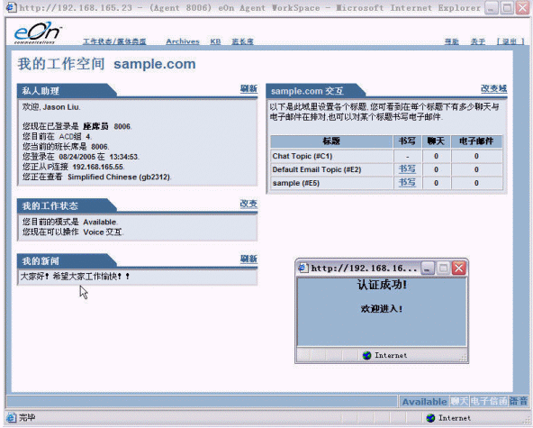 上圖是eQueue坐席員的標準工作界面,其中左側包含的信息有:坐席員個人資料、隸屬的坐席組、工作狀態(tài)、可服務的媒體類型、系統(tǒng)公告;右側有隊列中處于等待狀態(tài)的呼叫請求數(shù)量。界面上方設置有益昂公司特色的知識庫(KB)鏈接,單擊鏈接可以查找到客戶所關心問題的標準回復內(nèi)容。在這個界面里,坐席員可以完成包括語音呼叫、電子郵件在內(nèi)的所有工作。
