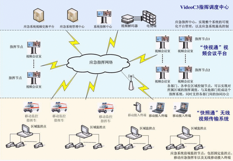 C3I視頻應急指揮協(xié)同系統(tǒng)在政府IP網(wǎng)絡中處于城市的神經(jīng)中樞。它將政府各個部門、單位聯(lián)系成為一個整體。在C3I視頻應急指揮協(xié)同系統(tǒng)的前端,由"快照通"無線視頻傳輸系統(tǒng)對政府所屬各個單位進行實時監(jiān)控,時刻掌握現(xiàn)場動態(tài),該部分支持固定點監(jiān)控,也支持移動指揮點和無線移動接入終端,保證了前方工作的靈活、機動性;在系統(tǒng)的指揮中心部分,由VideoC3指揮調(diào)度中心來支持,它一方面需要對前端的監(jiān)控信息進行控制,同時,要對整個政府進行綜合管理調(diào)度,在發(fā)生突發(fā)狀態(tài)的時刻,現(xiàn)場前端"快照通"捕獲的相應信息通過C3I系統(tǒng)平臺,迅速傳遞至指揮中心部分,政府管理人員通過VideoC3指揮調(diào)度中心對前端進行遠程指揮,在第一時間緊急處理現(xiàn)場突發(fā)事件;在整個C3I系統(tǒng)中,政府各個部門、單位之間通過"快視通"視頻會議平臺進行辦公交流,支持各部門間的協(xié)同辦公,同時,也可以通過其實現(xiàn)對所屬區(qū)域的指揮調(diào)度。