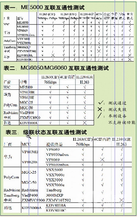 盡管自身能量有限,所采用的也是“病一個,治一個”的“笨”方法,但對于改善互聯(lián)互通性的作用還是很大的。根據(jù)H3C的所提供的資料顯示,其推出的ME5000多點控制單元以及MG6050/MG6050視訊終端能夠與絕大多數(shù)主流廠商的產(chǎn)品協(xié)同工作,只要雙方設備支持,H.239雙視頻流傳送、H.264視頻編解碼以及4CIF高清規(guī)格視頻傳送等功能幾乎都可實現(xiàn)。
