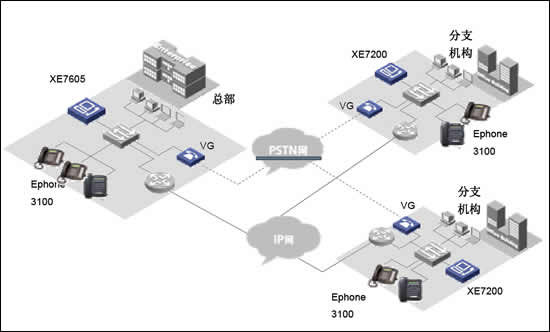當企業(yè)存在多個大型分部的時候,如一個國際性公司。則可以在各個分部部署XE7000冗余方案,每個分部維護獨立的本地用戶信息。各小分支機構的IP語音終端可以直接注冊到本地XE7000上,從而實現(xiàn)整網(wǎng)的分布式部署。