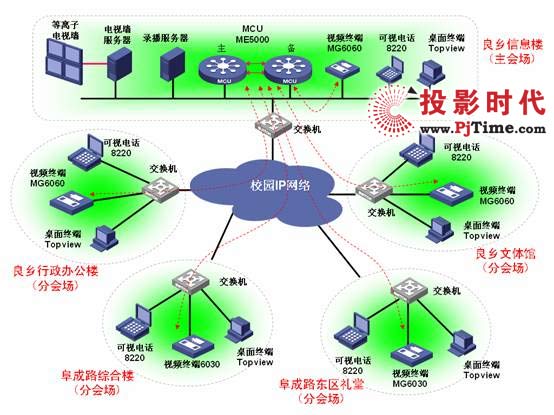 ME5000(配置32*768K)型MCU,在主會場及各分會場會議室共配置9臺高清會議室型會議終端(MG6060)和4臺標(biāo)清會議室終端(MG6030);同時學(xué)校領(lǐng)導(dǎo)桌面部署120部可視電話和12套桌面終端,具體視頻會議組網(wǎng)拓?fù)鋱D如下所示: