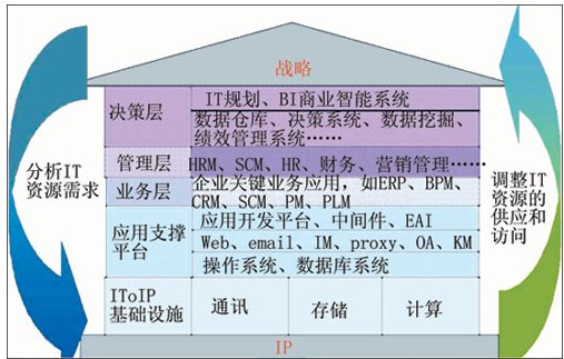 按照華為3Com的構(gòu)想,如果把整個IT系統(tǒng)比做一座房屋,那么整個房屋的地基就是IP網(wǎng)絡(luò),需要基于IP網(wǎng)絡(luò)來構(gòu)建通信、存儲、計算等IT基礎(chǔ)設(shè)施。在這些基礎(chǔ)設(shè)施之上,則是應(yīng)用支撐平臺(操作系統(tǒng)、數(shù)據(jù)庫系統(tǒng)、應(yīng)用開發(fā)平臺等),基于應(yīng)用支撐平臺提供給機構(gòu)的關(guān)鍵業(yè)務(wù)流程信息系統(tǒng)(如ERP、SCM等),最終為用戶的管理和決策提供支持。“在戰(zhàn)略與IT基礎(chǔ)設(shè)施之間實現(xiàn)實時同步互動,IT為用戶高層提供商業(yè)智能系統(tǒng)、決策系統(tǒng),以便決策層即時掌握信息,作為機構(gòu)戰(zhàn)略決策、戰(zhàn)略挑戰(zhàn)的依據(jù);用戶可以依據(jù)內(nèi)、外部變化,進行戰(zhàn)略調(diào)整時快速分析新的IT資源需求,同步調(diào)整IT資源的配置,從而使IT與業(yè)務(wù)戰(zhàn)略保持同步。”這正是IToIP的基本理念。