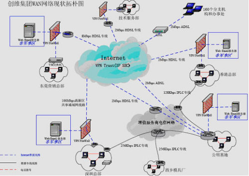 ·整個網(wǎng)絡連通性很差:隨著公司業(yè)務發(fā)展和規(guī)模擴大,現(xiàn)在整個集團除總部外還包括13個產(chǎn)業(yè)公司和全國160個分支機構,分布在以深圳為中心的全國各個地方,目前各產(chǎn)業(yè)公司之間的網(wǎng)絡連接除深圳總部、香港、公明基地和西鄉(xiāng)模具廠四地之間是通過窄帶IPLC專線連接外,其他各地均通過Internet公網(wǎng)連接,沒有構成統(tǒng)一的企業(yè)內部網(wǎng)絡互連。