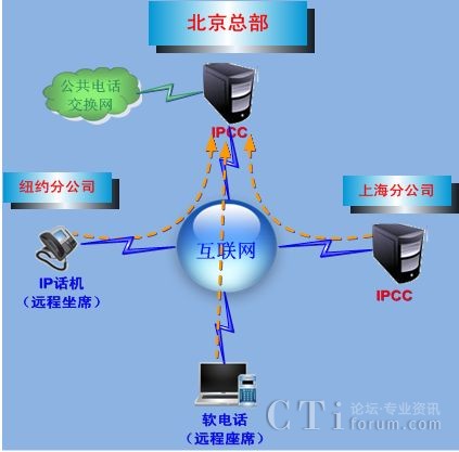 客戶采用IPCC-100型的IPCC系統(tǒng)組建一套分布式呼叫中心系統(tǒng)。它不僅實現(xiàn)呼叫中心功能,又完全取代傳統(tǒng)PBX作為核心的通信系統(tǒng)?蛻艨偛咳萘繛50門分機(jī),30門用于呼叫中心坐席,20門用于辦公線路用。另有2個分支機(jī)構(gòu)分別配置一臺IX-50和IE-62,作為分公司的電話交換設(shè)備。通過互聯(lián)網(wǎng)與總部的IPCC點對點對接,實現(xiàn)內(nèi)部互通免費。