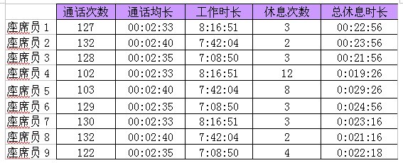 上面這張表格,畫出的就是9個座席員的話務(wù)數(shù)據(jù)情況,分別列出了通話次數(shù)、通話均長、工作時長、休息次數(shù)、總休息時長這五個KPI指標,你可以看的出來是哪一個座席員在呼攸嗎?