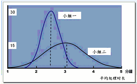 上面這張圖中,小組一的平均處理時(shí)長的標(biāo)準(zhǔn)差,顯然低于小組二,也就是小組一的座席員,大家處理時(shí)長差距都不大,都在2.5分鐘左右。