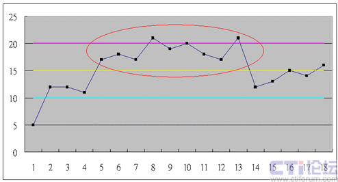 12就是數(shù)據(jù)有12個點,像是鋸齒一樣,在均值上下連續(xù)跳動(六西格瑪用到了14個點,我認為呼叫中心觀察到12個點就應該可以確認有特殊原因了)。