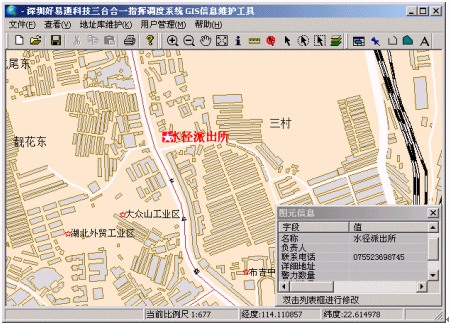 - 地圖維護(hù)功能:提供圖層數(shù)據(jù)管理、空間數(shù)據(jù)管理、圖形編輯管理,系統(tǒng)還提供大量的點、線、區(qū)域的形狀元素,可添加修改點(公安、消防、醫(yī)院等重點單位)、線(道路等)、面(街區(qū)、轄區(qū)等)等地理要素以及對地理要素的名稱、電話號碼等相關(guān)信息進(jìn)行查看與修改。