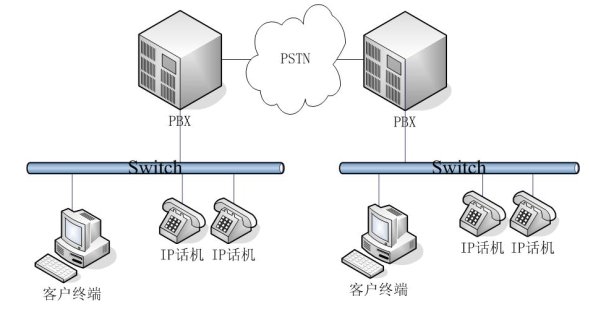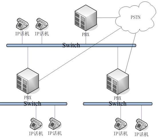 - 普通網絡結構:適用用于中型企業(yè)。在不同地域有公司分部,各分部之間通訊需要通過PSTN,每個分部都有自己的PBX。相對于每個分部而言,采用的是簡單網絡結構。