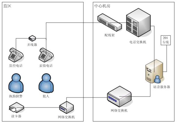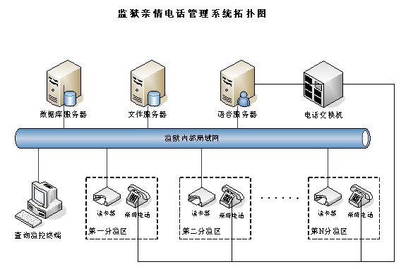 親情電話管理系統(tǒng)在系統(tǒng)設(shè)計中充分考慮監(jiān)獄的需求與特點,不但包含了一般親情電話錄音所需的全部功能,而且還融合了獄政管理的功能,整個系統(tǒng)采用集中式方式,在中心機(jī)房部署一套親情電話錄音服務(wù)器,各個監(jiān)區(qū)監(jiān)控系統(tǒng)利用監(jiān)獄內(nèi)部的局域網(wǎng)聯(lián)結(jié)成一個整體,形成一個能監(jiān)控監(jiān)獄親情電話的全網(wǎng)。這樣即可以在每個監(jiān)區(qū)監(jiān)聽,也可以在監(jiān)獄內(nèi)部網(wǎng)的任何地方對親情電話進(jìn)行全程監(jiān)視。該系統(tǒng)能夠完全滿足目前監(jiān)獄的需求,產(chǎn)品性價比遠(yuǎn)遠(yuǎn)高于市場上其他同類產(chǎn)品。