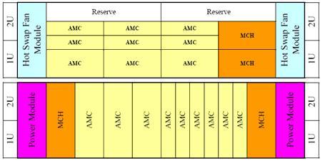 Carrier Manager)。即,MicroTCA系統(tǒng)的MCH相當于ATCA系統(tǒng)的ShMC+Fabric+Carrier。MCH采用了與AMC完全相同的連接方式,結構尺寸與半寬全高的AMC模塊完全相同,連接方式也完全相同。
