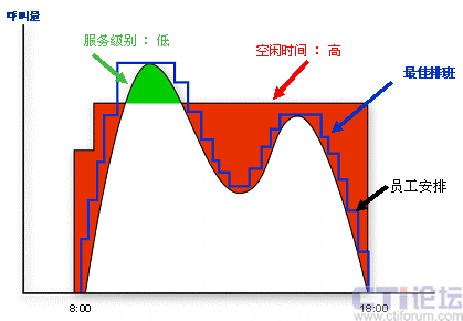 如果僅僅是工作量大,我想排班員還能夠忍受,更要命的是,排出的班表不能做到精確。要么人員太多,導(dǎo)致運(yùn)營(yíng)成本上升;要么人員不夠,無(wú)法達(dá)到預(yù)期的服務(wù)目標(biāo)。以呼叫中心典型的雙峰曲線為例(如右圖),排班所追求的是人力安排和話務(wù)曲線的盡可能吻合(也就是圖中藍(lán)色的最佳排班線),達(dá)到在滿足服務(wù)水平的基礎(chǔ)上盡可能少的安排座席資源。而在手工排班中,由于大量的采用組排班,組中成員同時(shí)上下班、同時(shí)午餐,導(dǎo)致人力安排的靈活性降低,不能盡可能的去擬合話務(wù)曲線。此外,參考前面談到的影響人力安排的因素,手工排班中考慮了環(huán)境的影響,部分考慮了縮減,但座席技能因素考慮很少,基本認(rèn)為所有人員的技能熟練度一致,不可預(yù)見(jiàn)性縮減也沒(méi)有考慮進(jìn)去,導(dǎo)致最終會(huì)對(duì)服務(wù)水平造成負(fù)面影響。因此,手工排班是一種粗放型的排班方式,隨著運(yùn)營(yíng)要求的提高,表現(xiàn)出一定的不適應(yīng)性。