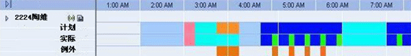 如圖,通過與PBX、CTI系統(tǒng)的接口,排班系統(tǒng)獲取座席的實時狀態(tài)信息,如登錄、接聽、話后處理、登出等,并以不同的顏色進行表示,與計劃的班次安排進行比對,從而監(jiān)控到座席的遵時例外(非遵時)。通過這種方式,座席的實時狀態(tài)變化能夠及時的得到監(jiān)控,便于管理人員精確的監(jiān)控遵時,同時,也把班長從遵時管理中部分解脫出來。