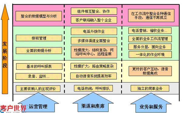 如圖一所示,國(guó)內(nèi)大多數(shù)企業(yè)呼叫中心基本經(jīng)歷了三個(gè)階段的發(fā)展,在呼叫中心建設(shè)初期,往往只是建設(shè)成電話熱線,座席人員接通電話,通過與客戶交流,利用簡(jiǎn)單獨(dú)立的呼叫中心應(yīng)用系統(tǒng),完成咨詢和接受訂單工作,在這階段對(duì)呼叫中心來講基本沒有什么管理,主要靠人的主觀評(píng)價(jià)來實(shí)現(xiàn)粗放運(yùn)營(yíng)。