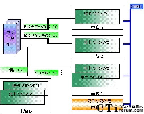 我們已知一個(gè)七號(hào)信鏈路組可以管理4096路話路,但在由于電腦速度的影響,單機(jī)容量很難超過480路(PCI),這樣在很多大容量系統(tǒng)中,我們的板卡就無(wú)法使用。在上圖所示的構(gòu)架中,只要增加電腦C類似的主機(jī)就可以了。