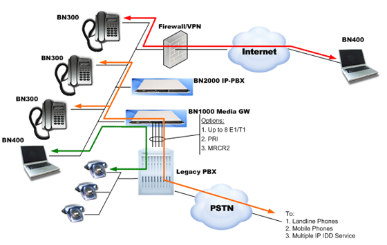 IP-PBX具有強(qiáng)大的動態(tài)路由選擇功能。將BN2000IP-PBX與BN1000網(wǎng)關(guān)配合使用,傳統(tǒng)PBX管轄下的每個模擬電話就會變身為BN300