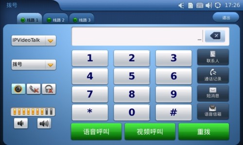 7寸大屏搭配寬大的數(shù)字虛擬鍵盤,讓你的撥號準(zhǔn)確無誤。同時界面的所顯示的通話功能諸如查找聯(lián)系人、查找通話記錄、發(fā)送短消息或者快速進入語音信箱等功能也清晰明了?梢园l(fā)現(xiàn)的是,用戶在輸完號碼之后可自主選擇采用語音呼叫還是視頻呼叫。另外,同潮流網(wǎng)絡(luò)之前的一款視頻電話GXV3140一樣的是,GXV3175也在出廠自帶了一個IPVideoTalk賬號。該賬號是出廠時就已配置好的,每一臺電話配備一個號碼并顯示在桌面上。也就是說,用戶在拿到GXV3175并聯(lián)網(wǎng)之后即可使用該賬號撥打免費的視頻電話了。這可是很多廠商所沒有的特殊功能。下面我們就使用隨機附送的IPVideoTalk賬號來撥打視頻電話。