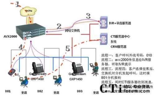 在方案中外線呼入IPPBX,IPPBX根據(jù)呼入路由指向特定rtsp號(hào)碼,rtsp根據(jù)配置引導(dǎo)IVR服務(wù)器開(kāi)始播放語(yǔ)音,客戶根據(jù)語(yǔ)音提示按鍵轉(zhuǎn)接坐席、傳真或自動(dòng)語(yǔ)音應(yīng)答等;坐席接聽(tīng)時(shí)同時(shí)屏幕彈出CRM中關(guān)于該來(lái)電號(hào)碼的相關(guān)信息,使坐席能做針對(duì)性的應(yīng)答和服務(wù),同時(shí)記錄報(bào)表數(shù)據(jù)供查詢。