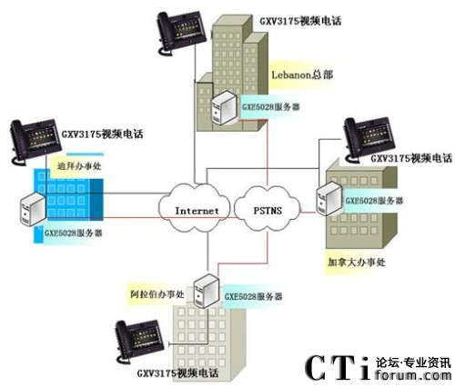在Tabbara公司的全球四個辦事處分別安裝潮流網(wǎng)絡(luò)的GXE5028 IPPBX服務(wù)器或者其他的SIP Sever通信平臺,GXE5028 IP PBX支持語音信箱,郵件和其他通信功能應(yīng)用,每一臺GXE5028最大限度地支持分布全球辦事處的所有通信賬號同時連接到同一網(wǎng)絡(luò)中,終端連接IP電話,IP視頻電話以及IP視頻監(jiān)控攝像機(jī)作為語音/數(shù)據(jù)的輸入輸出,當(dāng)然IP PBX也可通過網(wǎng)絡(luò)連接到VoIP服務(wù)器中間位置的SIP中繼。潮流網(wǎng)絡(luò)的GXV3175多媒體觸摸屏視頻電話,支持標(biāo)準(zhǔn)的SIP協(xié)議,先進(jìn)的H.264/H.263/H.263+視頻壓縮標(biāo)準(zhǔn),寬大的7寸彩色觸摸顯示屏實現(xiàn)溝通面對面的零距離交流,以及撥打網(wǎng)絡(luò)攝像機(jī)觀看監(jiān)控現(xiàn)場。潮流網(wǎng)絡(luò)的GXV3662_HD高清防暴半球IP攝像機(jī)和GXV3651_HD IP攝像機(jī),分別安裝在辦事處關(guān)鍵位置,365天,每周24*7個小時進(jìn)行實時監(jiān)控,作為企業(yè)財產(chǎn)和人員安全的保障。方案中,各分支機(jī)構(gòu)之間通話免費,撥打分支機(jī)構(gòu)所在地其他電話按市話費算,出差人員使用IP電話與公司內(nèi)部通話免費。
